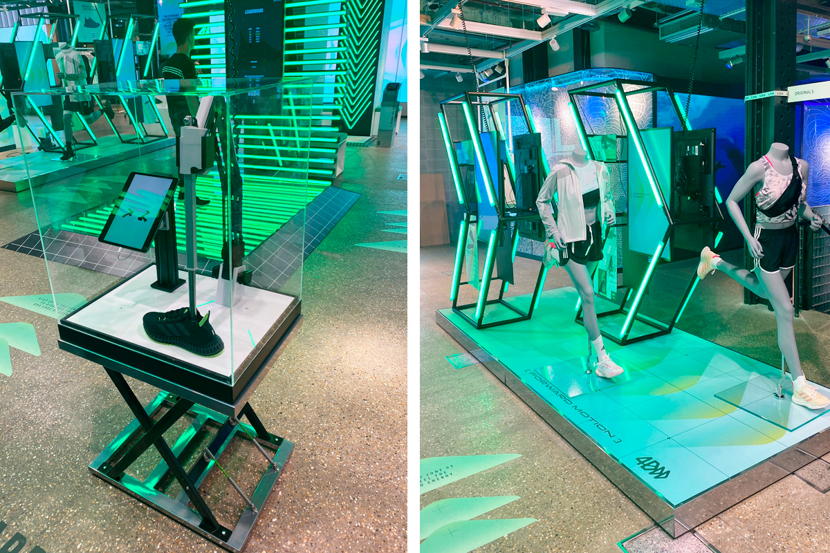 As the consumer walks in to the main LZ they are confronted with an adidas 4DFWD test facility. This area has been created to put focus on the R+D / benefits of forward thinking product development. The space has been designed to “move the consumer forward”.